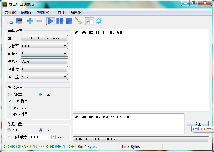 這樣,在串口調試助手中就可以看到正確的modbus返回碼