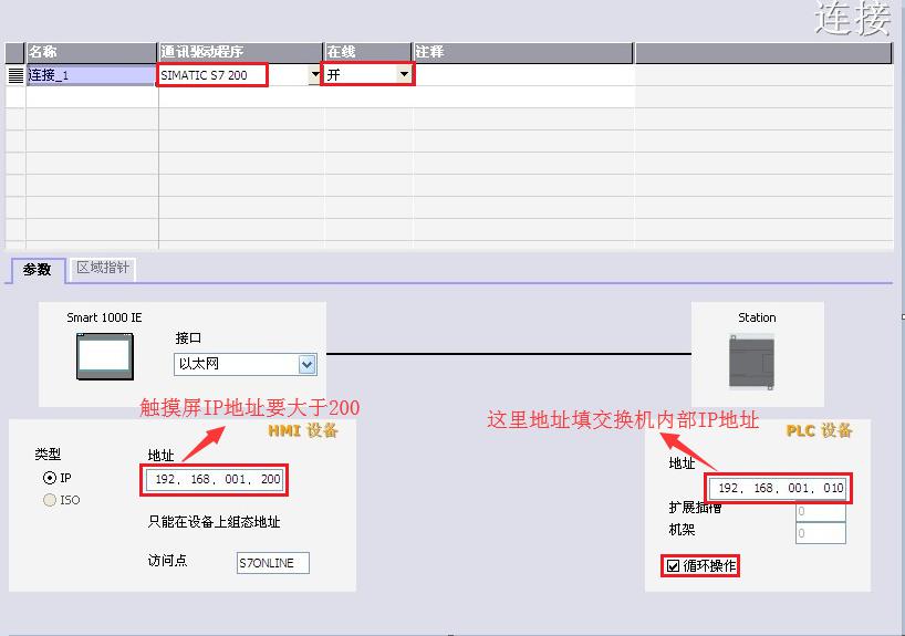 2.在 WinCC Flexible 中【連接】——【接口】選“以太網”、通訊驅動程序選“S7-200”、PLC設備[地址]填入多功能交換機內置 IP 地址 [默認:192.168.1.10] ,【循環操作】打對號“√”;另外SMART LINE 觸摸屏(HMI)的 IP 地址也應設置在同一段內,例如:192.168.1.200(而且最后一網段地址是大于200的)。