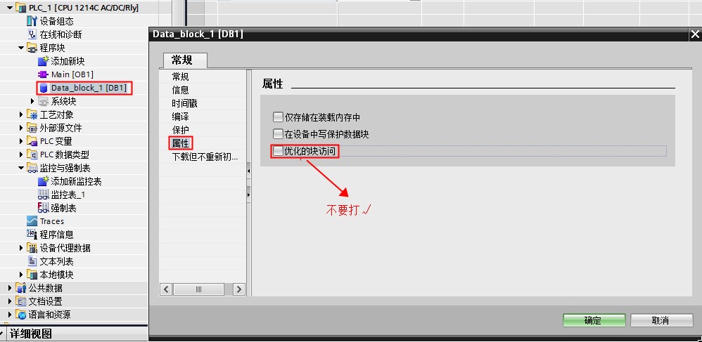 3.在 S7-1200/S7-1500PLC的編程軟件TIA Portal中,初始定義 DB 塊時, 【優化的塊訪問】的選項不要打對號“√”。