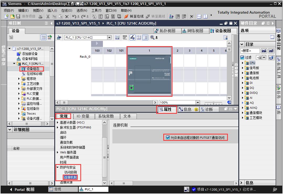 4.博途中的設備組態--->屬性--->防護與安全--->連接機制---->允許來自遠程對象的PUT/GET通信訪問打“√”。